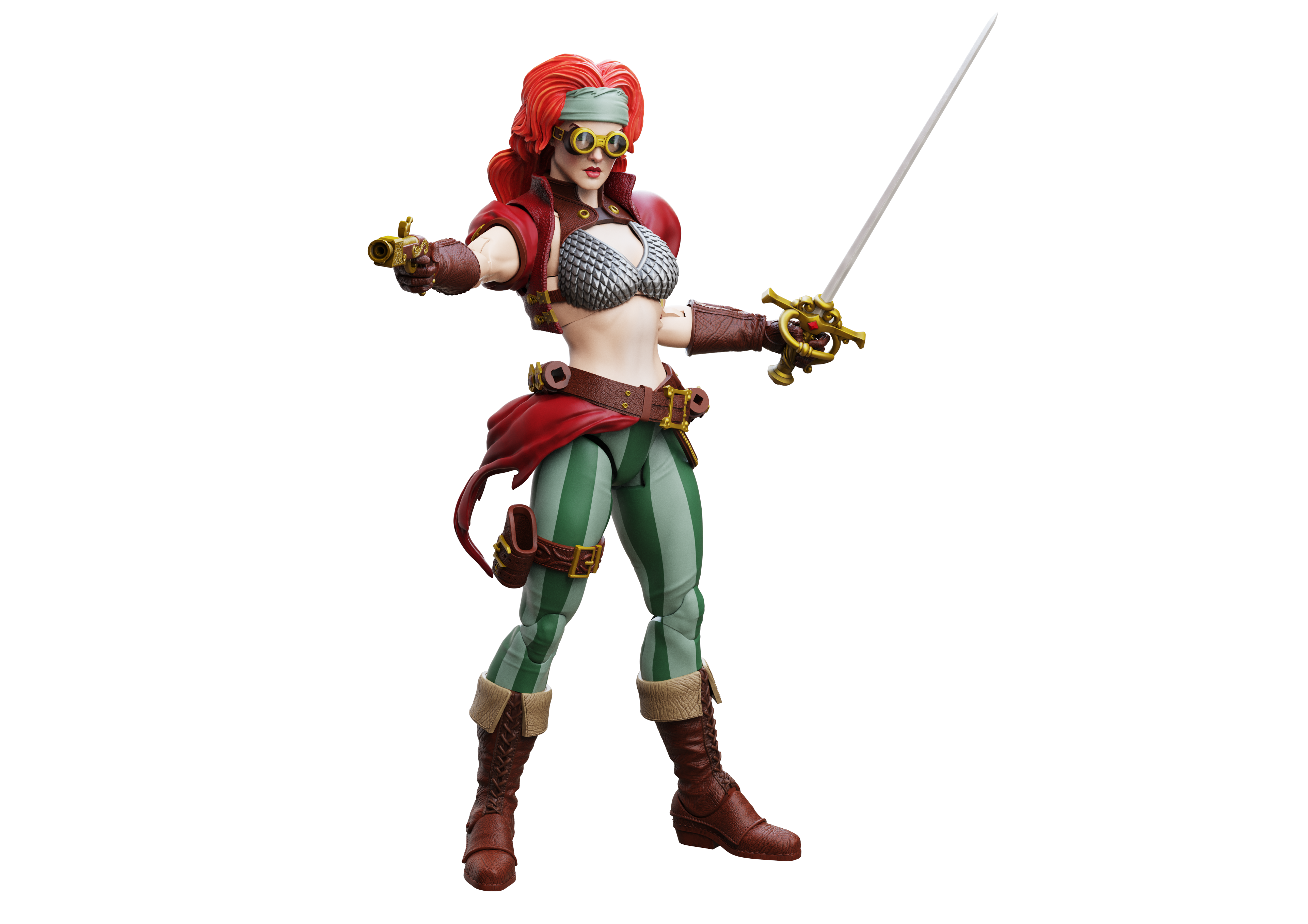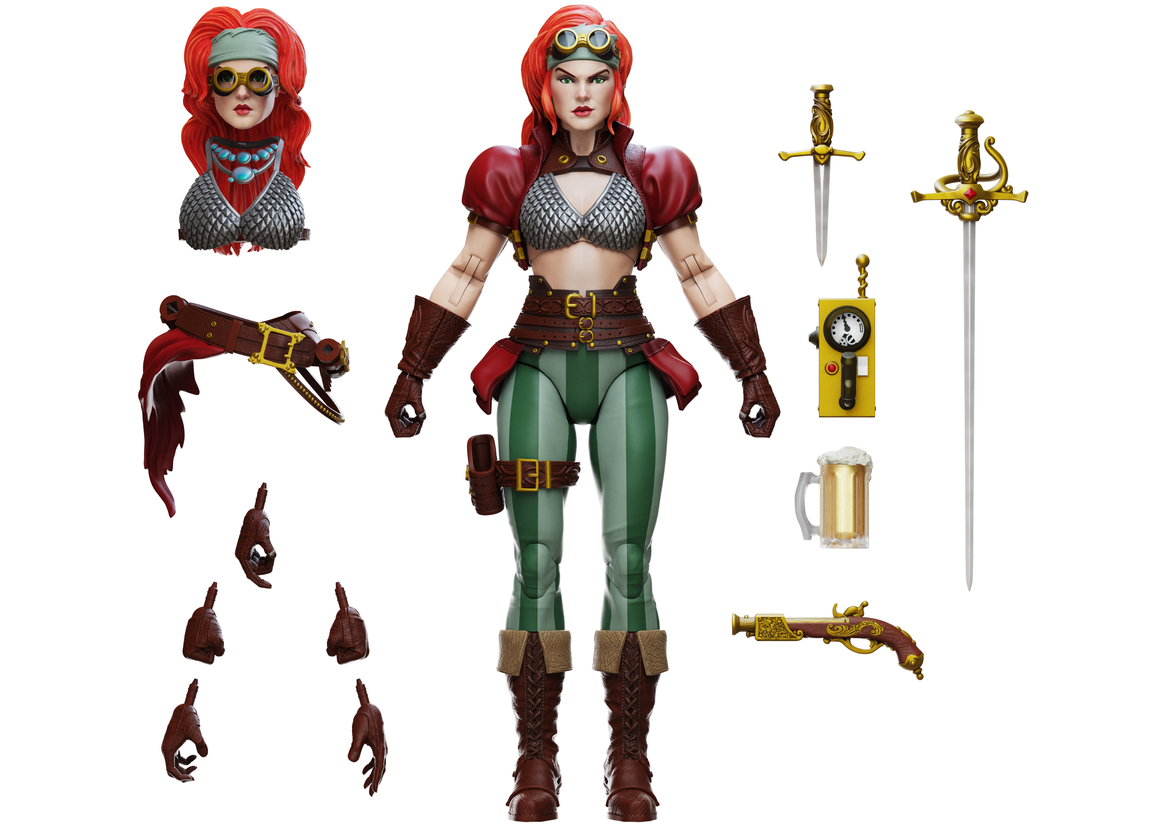 Figure includes 2 Portraits, Rapier, Dagger, 2 Armored Tops, Swashbuckling Belt, Petticoat, Geiger Counter, Flintlock Pistol, Hip Holster, Stein, 3 Sets of Hands, and figure base.