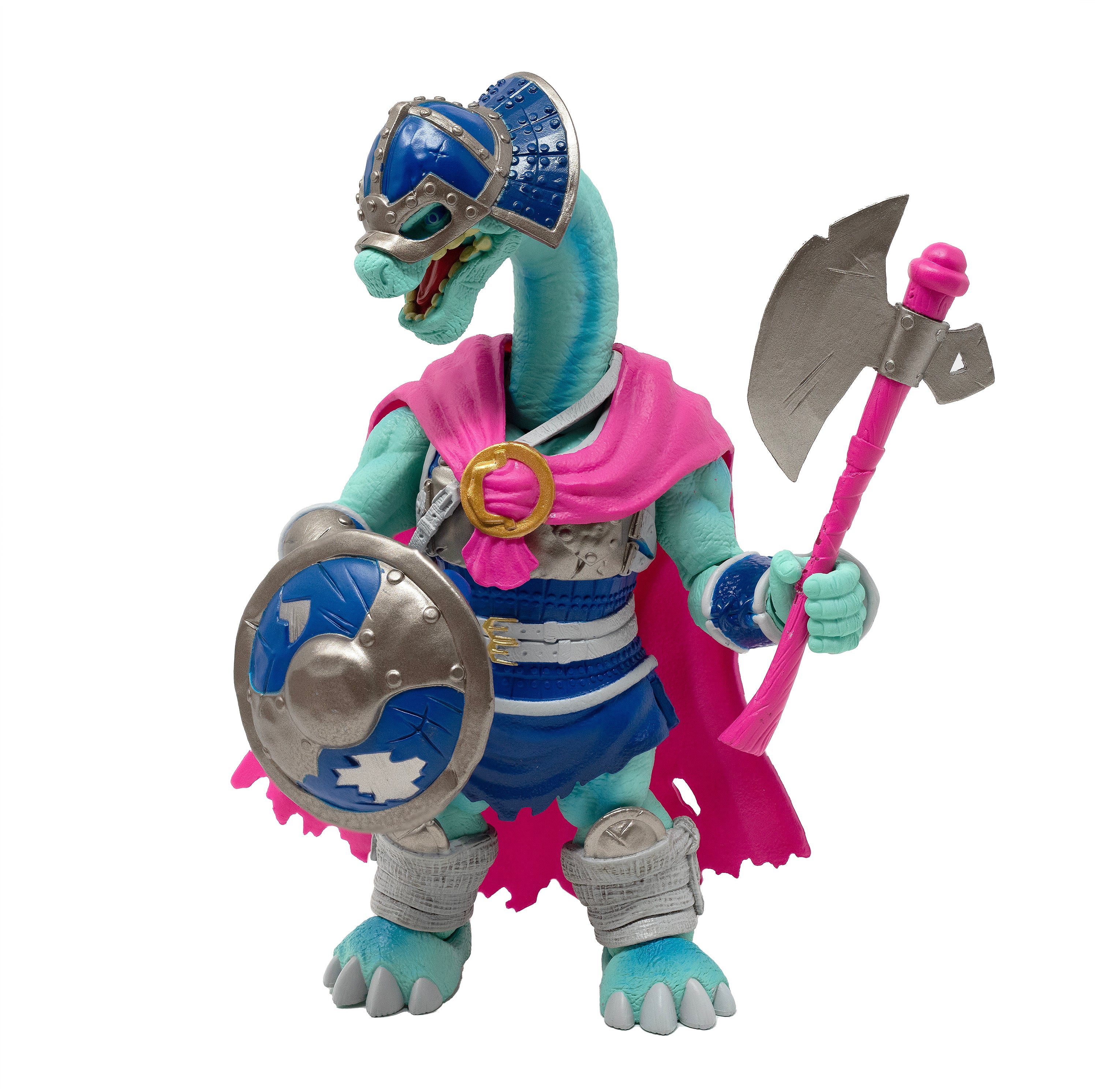 Saurozoic Warriors are battling dinosaur fighters inspired by the old skool action figures of the 90’s! Each fully articulated figure is 6-inch scale and comes with a full range of wild accessories. Kolig Shipbreaker is the head of a vicious band of raiders that travels the seas of northern Sauria. He and his clan take what they want by force and are experts in navigation and survival in a harsh, cold climate. Figure has 26 points of articulation and includes helmet, cloak, axe, crossbow and shield.